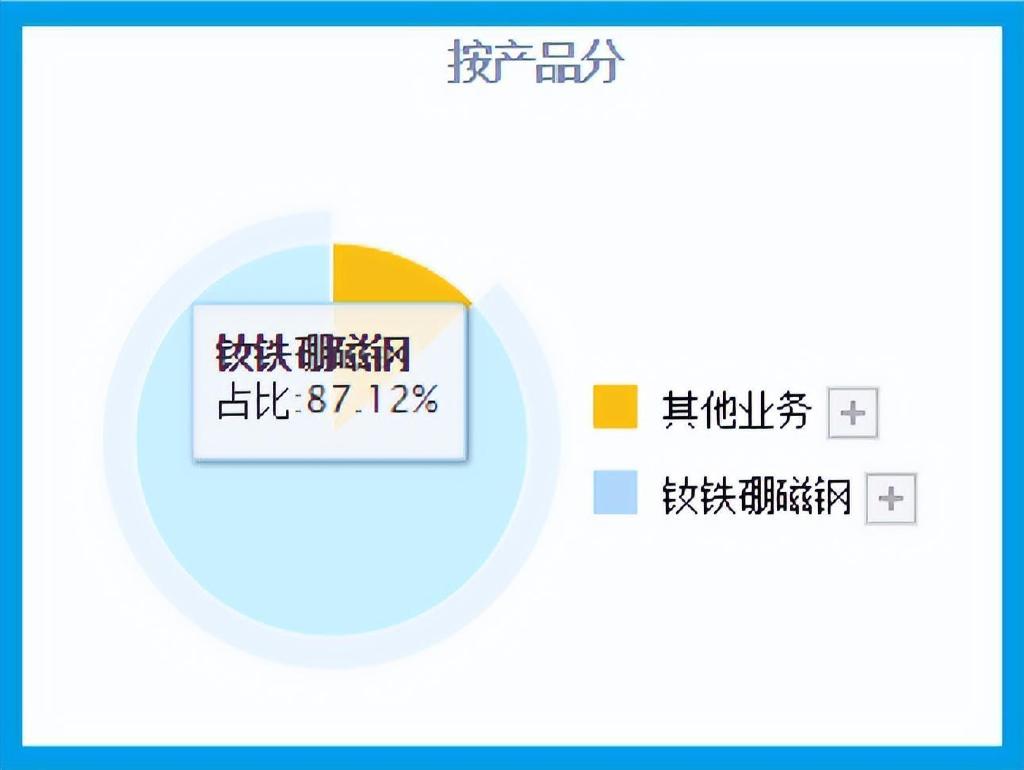 这家公司钕铁硼磁钢的收入占比为87.12%,其他业务的收入占比为12.88%。