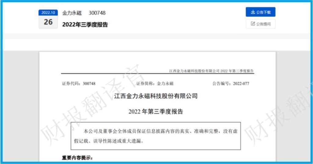 大家好我是财报翻译官,今天将调研A股稀土永磁概念板块中,金力永磁(股票代码:300748)这家上市公司2022年第三季度财报,下面进入今天的主题。