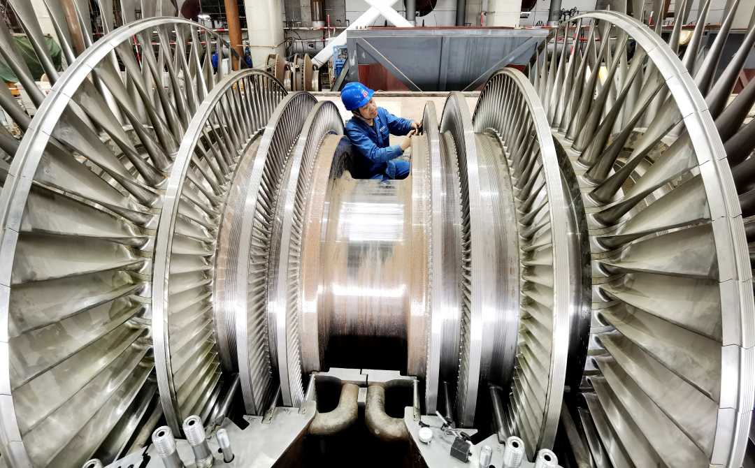 4月13日,江苏省射阳港电厂的员工正在安装汽轮机。