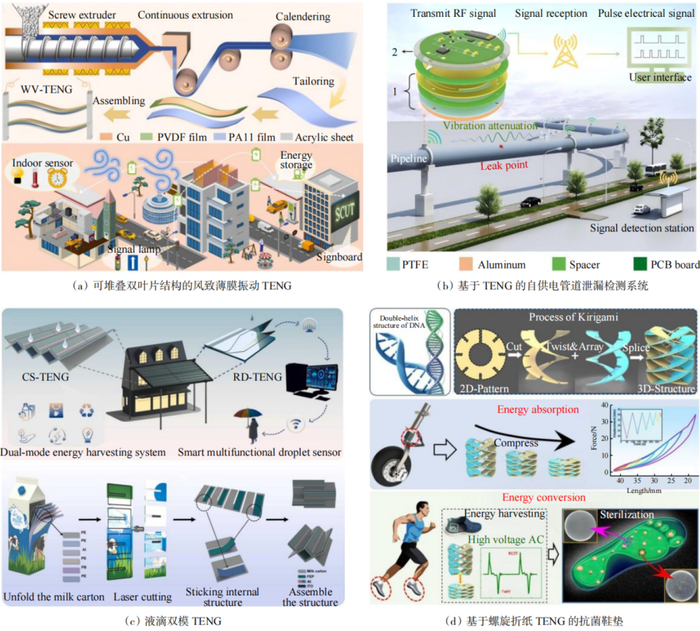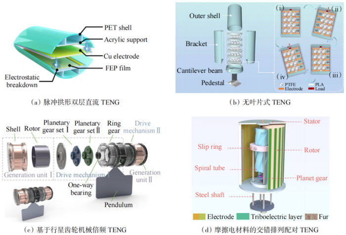 2025年,研究人员在之前的研究基础上,从精细优化其摩擦介电材料性能、持续升级其结构设计和能量管理策略等多维度协同出发,使TENG综合性能进一步提升,为其走向实际应用奠定基础。