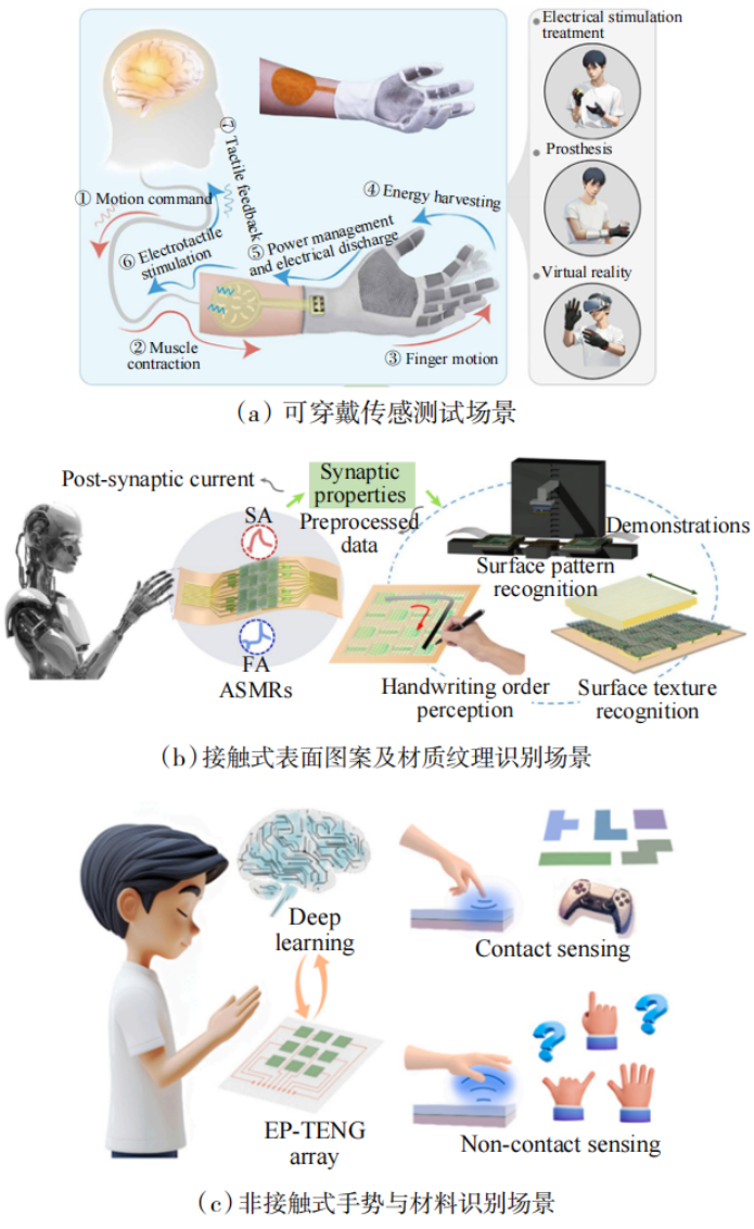 Hong等进一步优化传感结构,开发出兼具慢适应与快适应特性的人工突触机械感受器阵列(图6(b)),拓展了其在智能检测、人机交互等领域的应用场景。Li等构建接触−非接触双功能传感系统(图6(c)),彻底突破了传统传感器对物理接触的依赖限制,将摩擦电传感技术推向非接触感知的新维度。