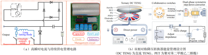 2025年在能源管理方面也取得了显著的进展,针对低电平、间歇输出设计定制电源管理电路(图4(a)),实现高瞬时电流与持续供电。构建双相对称降压转换器(图4(b))解决三元直流TENG输出存在阈值和电压不可控特性问题,实现电容交替充放电,从而获得高功率密度与电压稳定输出。综上所述,创新的能量管理电路有效缓解了TENG输出不稳定和阻抗不匹配等问题,为其在自供电系统中的应用奠定了基础。