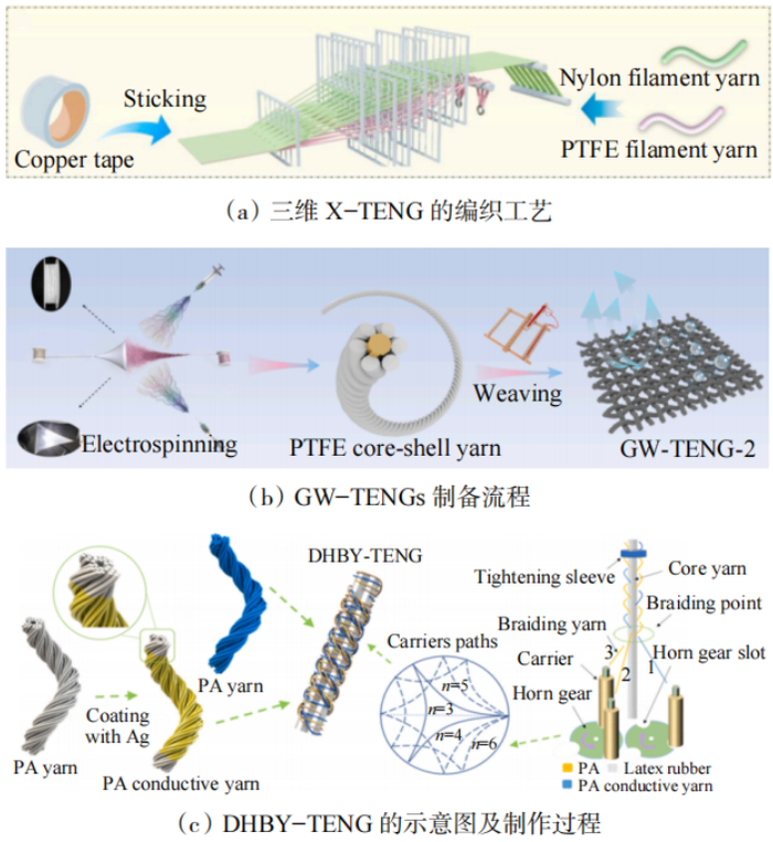 无间隔纱线3D−X形织物、中空锭花式加捻技术制备的3D蜂窝结构织物等创新结构,进一步优化了TENG的透气性和力学稳定性(图8(a))。
