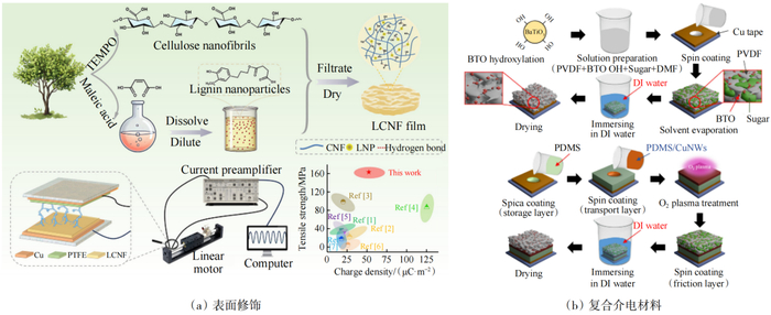 为了构建出高性能的TENG,研究人员从摩擦介电材料的表面形貌、组成成分变化等方面展开了相关的探索。