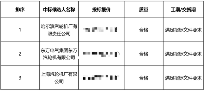 001汽轮机中标候选人第一名为哈尔滨汽轮机厂有限责任公司;
